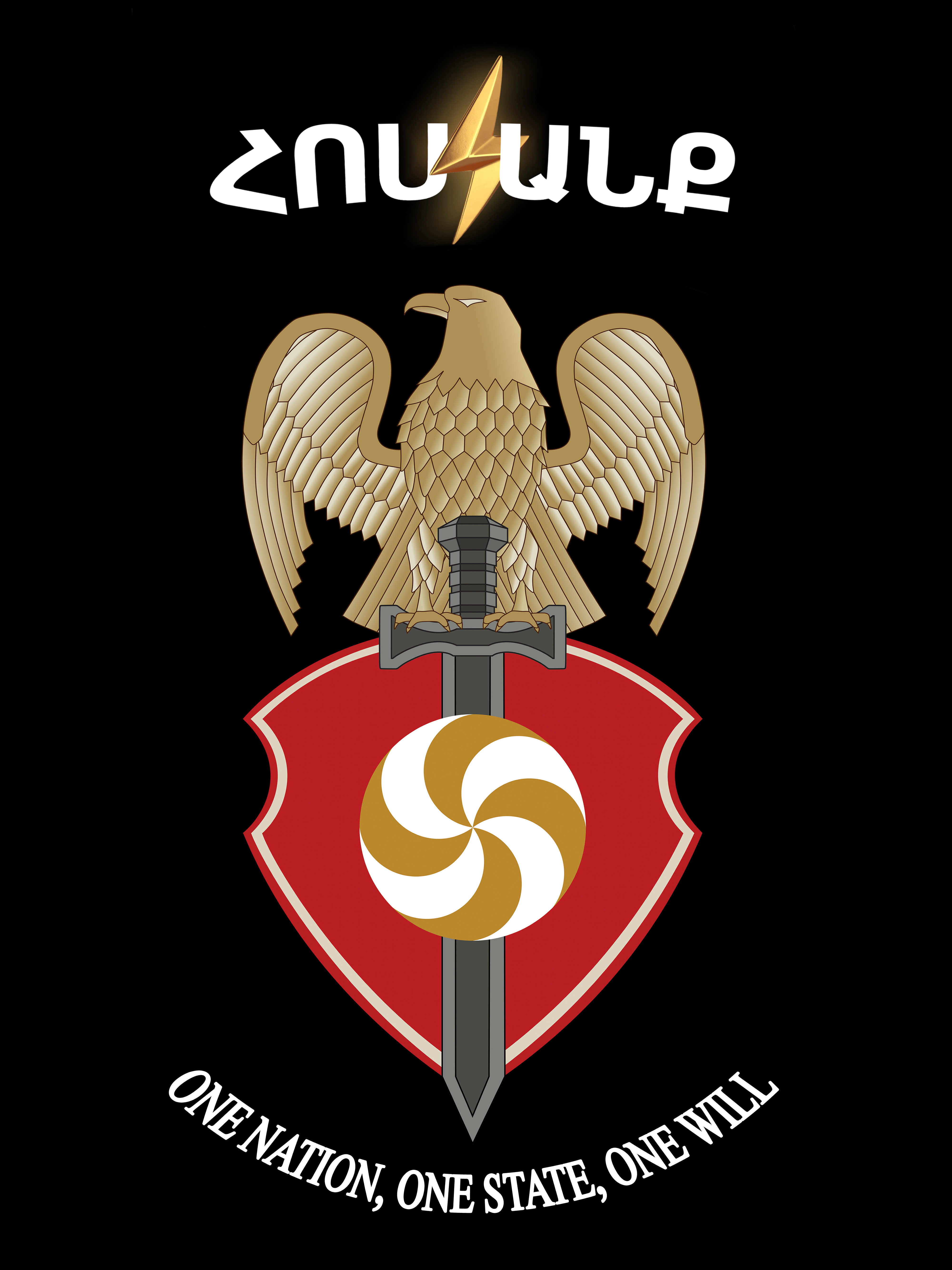 In the gold we see the noble values of our Aryan culture; in the white, our national ideals; and in the dark red, the blood spilled for the independence and prosperity of our fatherland. Within the eternity sign, we also see the victory of the eternal struggle for the development of our race. All this aligns with one of our slogans: “Honor Your Culture, Love Your Nation, Defend Your Fatherland.” The gold and dark red were also the royal colors of the Artaxiad dynasty of Armenia, particularly under Tigranes the Great, during whose reign Greater Armenia reached its zenith. The white was the color of the Bagratid dynasty and later the Armenian Kingdom of Cilicia—states that, through national struggle, restored our sovereignty. Thus, by combining our ancient royal colors with our invincible national symbol—the eternity sign—we will restore the glory and honor of our fatherland and state.