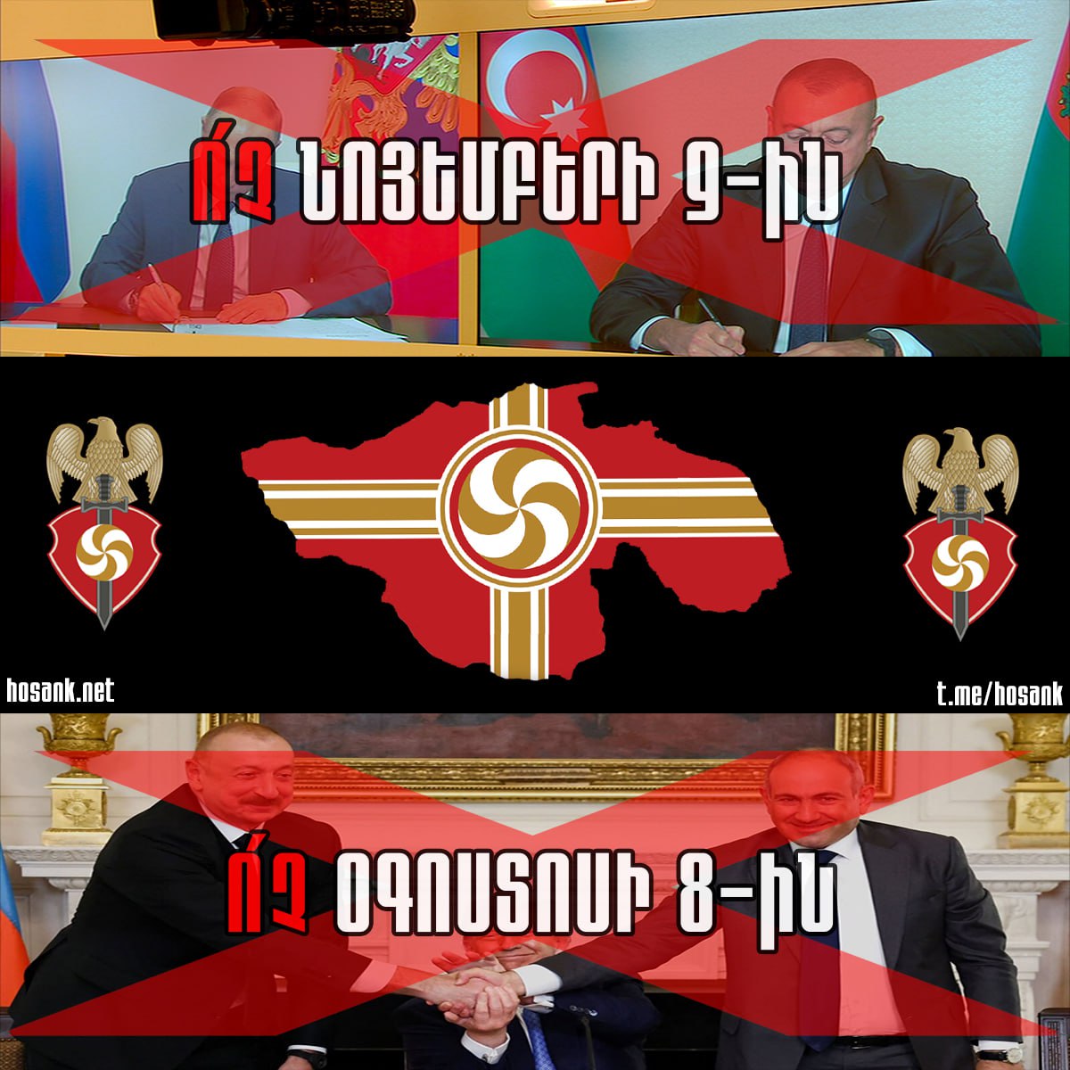 Ռուսամետները կողմ են Նոյեմբերի 9-ի հայտարարությանը և դեմ՝ Օգոստոսի 8-ի համաձայնագրին, իսկ արևմտամետները կողմ են Օգոստոսի 8-ի համաձայնագրին և դեմ (ոչ բոլորը)՝ Նոյեմբերի 9-ի հայտարարությանը: Իսկ հայամետ ազգայանականները երկու փաստաթղերին դեմ են, քանի որ երկուսն էլ Հայաստանի համար նվաստացուցիչ ու հակահայկական են, որոնք ոչ միայն ամբողջությամբ դեմ են մեր ազգի շահերին, այլև ուղիղ վտանգ են սպառնում մեր անկախ պետականությանը: Օգոստոսի 8-ը փաստացի Նոյեմբեր 9-ի շարունակությունն է և ողջամիտ հայրենասերի համար անհնար կլինի մեկին դեմ լինել առանց մյուսին դեմ լինելու: Երկուսն էլ բխում են ռուս-թուրք-սիոնիստական շահերից՝ փաստացի ճանապարհ բացելով, որ ահաբեկչական ու հանցագործ պետություն Ադրբեջանը իր լիակատար գերակայությունը հաստատի Հայաստանի վրա՝ մասնատելով ու ոչնչացնելով մեր պետությունը: Երբ ազգային քաղաքական շարժումը գա իշխանության և կերտի իրապես ազգային պետություն, պարտավոր է չեղարկել, պատռել և պատմության աղբանոցը նետել այս երկու չարաբաստիկ փաստաթղթերը: Մենք միայն կողմ ենք այն փաստաթղթերին, որը մենք մեր ուժով ստիպելու ենք ոսոխին ստորագրել՝ կամաց-կամաց ճանապարհ բացելով Մեծ Հայքի կերտմանը: Մեզ շատերը կարող են համարել «երազող», «ռոմանտիկ» կամ «ֆանատիկ», երբ մեր շուրթերից նման բաներ են լսում, բայց մենք ընդհանրապես ոչ մի խնդիր չունենք դրա հետ։ Ավելի լավ է այդպիսին լինենք, քան մուրացող, վախկոտ, խղճուկ, ստրկամիտ ու դավաճան։ Մեկ Ազգ, Մեկ Պետություն, Մեկ Կամք Փա՛ռք Հայքին ու Հաղթանակին