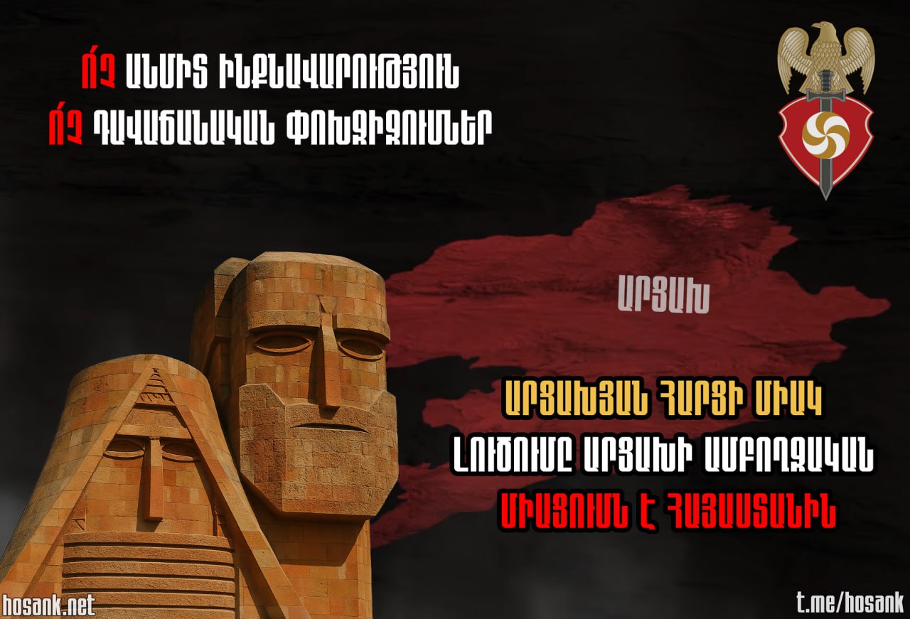 Հակահայ իշխանության ու հայրենադավ՝ «նախկիններից» բաղկացած ընդդիմության ներկայացուցիչները անամոթաբար անընդհատ խոսում են հայրենասիրությունից և արժանապատվությունից, բայց 26 տարում՝ ռազմի դաշտում մեր ազատամարտիկների կողմից ազատագրված՝ 10,000 քկմ Արցախը չկարողացան (կամ ավելի ճիշտ՝ չուզեցին) ընդամենը միացնել Հայաստանին և թղթով Ադրբեջանին պարտադրել Արցախը ամբողջությամբ ճանաչել Հայաստանի կազմում։ Հաղթած պետություն ժառանգեցին, բայց 26 տարում այս փոքր խնդիրը չլուծեցին. սա կամ տոտալ ապիկարություն է, կամ պարզ դավաճանություն, կամ երկուսը միասին։ Եթե հաղթած պետությանը այս օրին հասցրին, դե պատկերացրեք՝ ի՞նչ են անելու պարտված պետության ղեկը կառավարելով։ Ջհուդի փեսա ԼՏՊ-ից սկսած՝ ԲՈԼՈՐ ղեկավարները հարվածել են Արցախին և հաղթած դիրքից աստիճանաբար իջեցրել այս խայտառակ վիճակի։ Սա բնական է, քանի որ դավաճան բոլշևիկ չեկիստների ժառանգներից այլ բան սպասելը անհեթեթություն կլինի։ Եթե իրական ազգային առաջնորդ ունենայինք՝ 94թ․-ի զինադադարին կամ նույնիսկ հենց 2020թ․-ի պատերազմի սկզբին, մենք միանգամից՝ ամենահայանպաստ ձևով կարող էինք լուծել Արցախյան հարցը՝ Արցախը ամբողջությամբ միացնելով Հայաստանին, ինչպես ցանկանում էին 1988-թին դուրս եկած հայրենատեր հայերը։ Դավաճանները ու մեր թշնամիները Արցախյան հարցը արհեստականորեն դարձրին շատ բարդ մի խնդիր, որի լուծումը մեր հասկացողությունից դուրս է։ Այդ խնդրի լուծումը ավելի բարդ ներկայացրին, քան հավիտենական շարժիչ ստեղծելը։ Սա դիտմամբ էր արվում, որպեսզի պատրանք ստեղծեին և մեզ շեղեին պարզ իրականությունից։ Սակայն բոլոր արժանապատիվ ու ազգայնական հայերի համար Արցախյան հարցը, բացի համընդհանուր միացումից մեր Հայրենիքին, այլ լուծում պարզապես չի կարող ունենալ։ Երբ Հայաստանը մի օր ունենա իսկապես ազգային պետություն, կկարողանա՝ անգամ այս պարտված վիճակում, տասը անգամ ավելի արագ լուծել Արցախյան հարցը, քան նրանք՝ հաղթած վիճակում։ Մեկ Ազգ, Մեկ Պետություն, Մեկ Կամք Փա՛ռք Հայքին